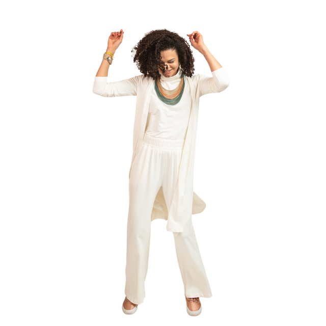 All of our fabrics are locally sourced in Brazil. Our garments are made by hand in small, female owned and operated workshops.